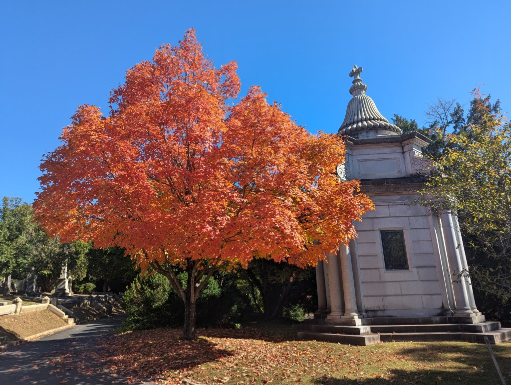 Hollywood Cemetery is maze-like, even with the help of street signs, and although we are talking about a cemetery, its morbidity is easily overlooked by the beauty and uniqueness that you can’t help but appreciate. It was the middle of fall during that initial visit, and many of the trees, which had signs gingerly placed on their trunks to display their species name, were ablaze with color due to the change of the season, with hues of gold, red and yellow leaves exploding from their branches.